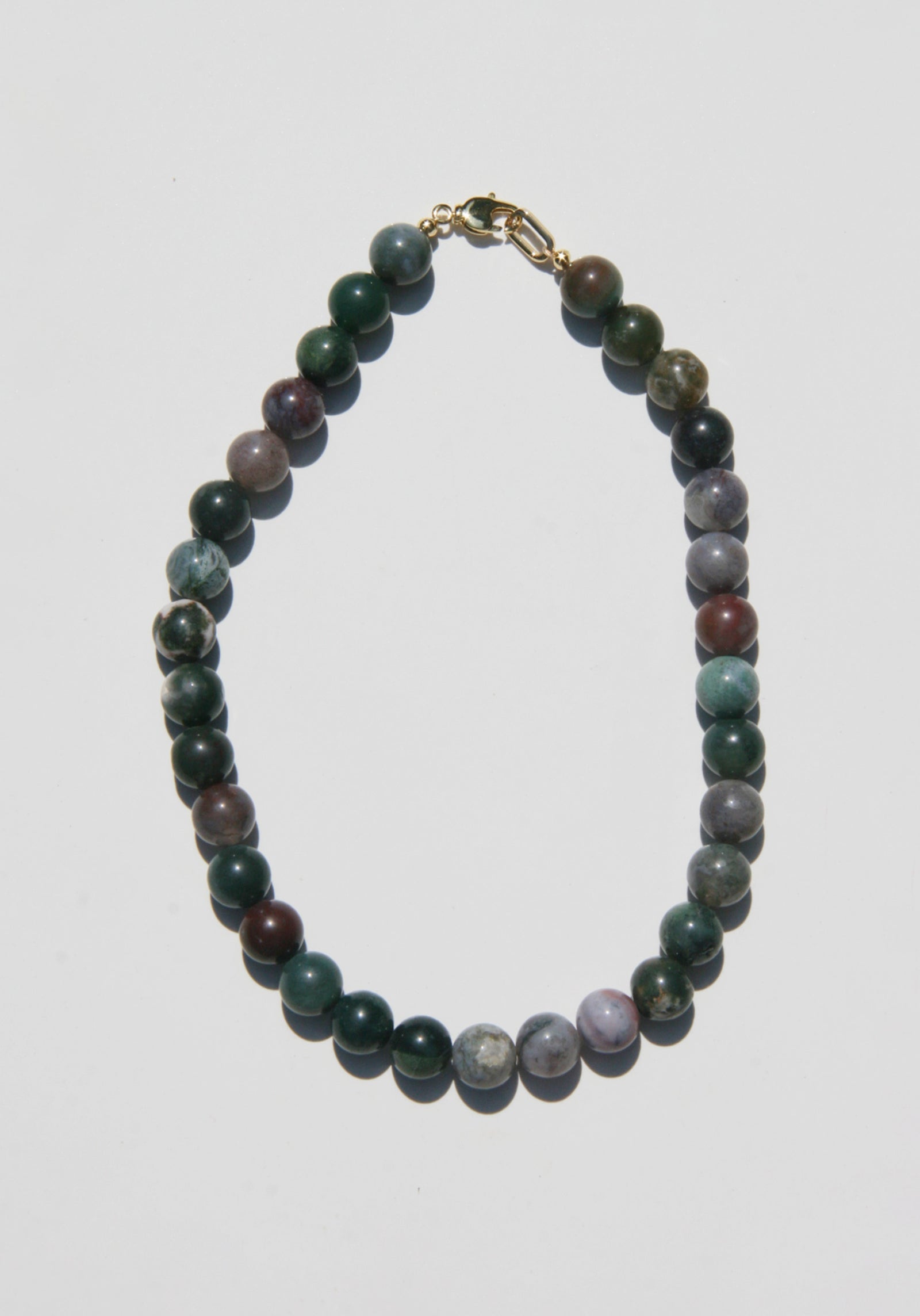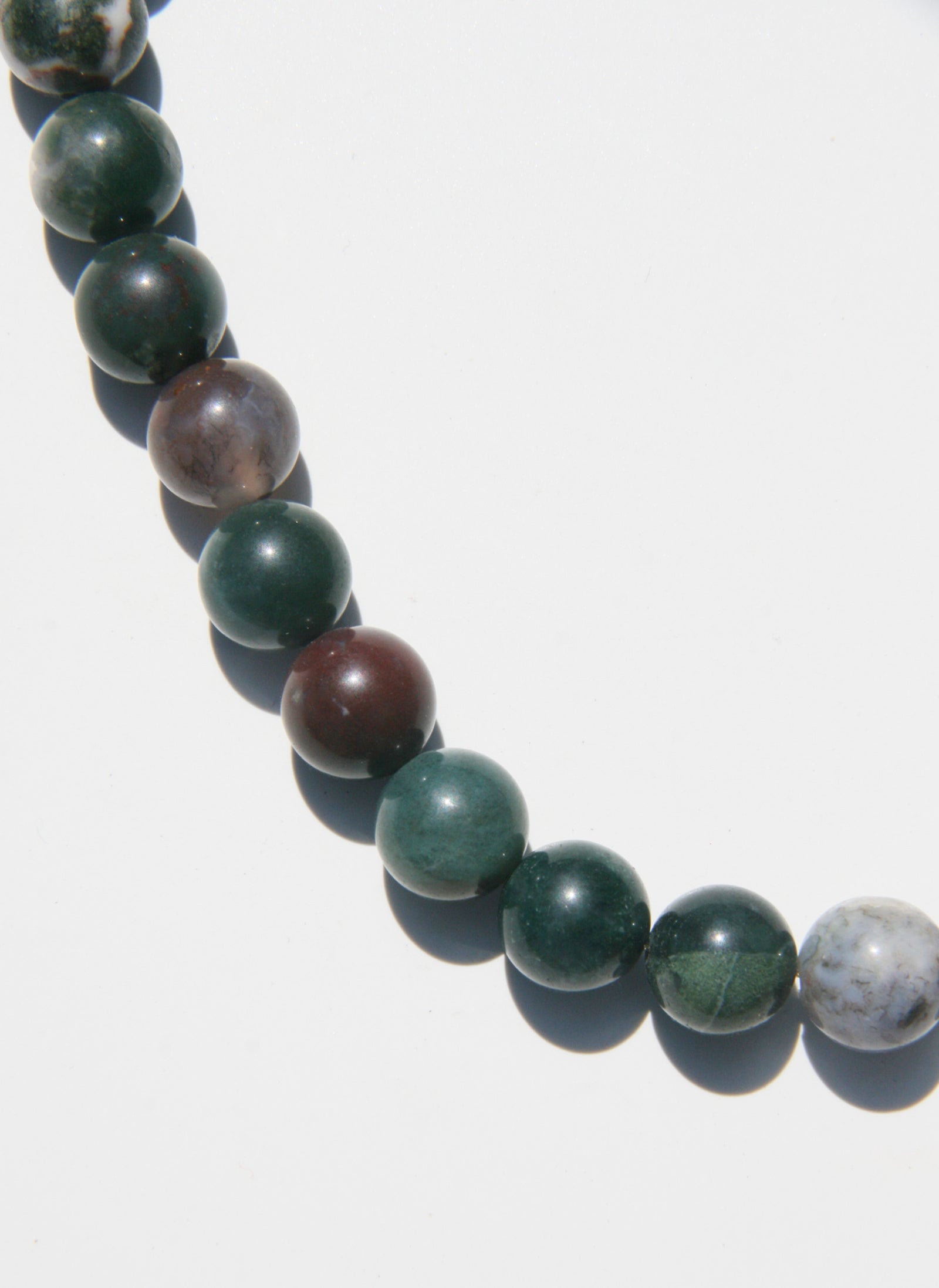 Beaded necklace with muted tones of purples and greens, lending a lush and vibrant look. Crafted with smooth Indian Jasper beads, Jardin offers a refined elegance with its subtle yet vivid color palette. The gemstone's natural properties promote grounding, stability, and balance.