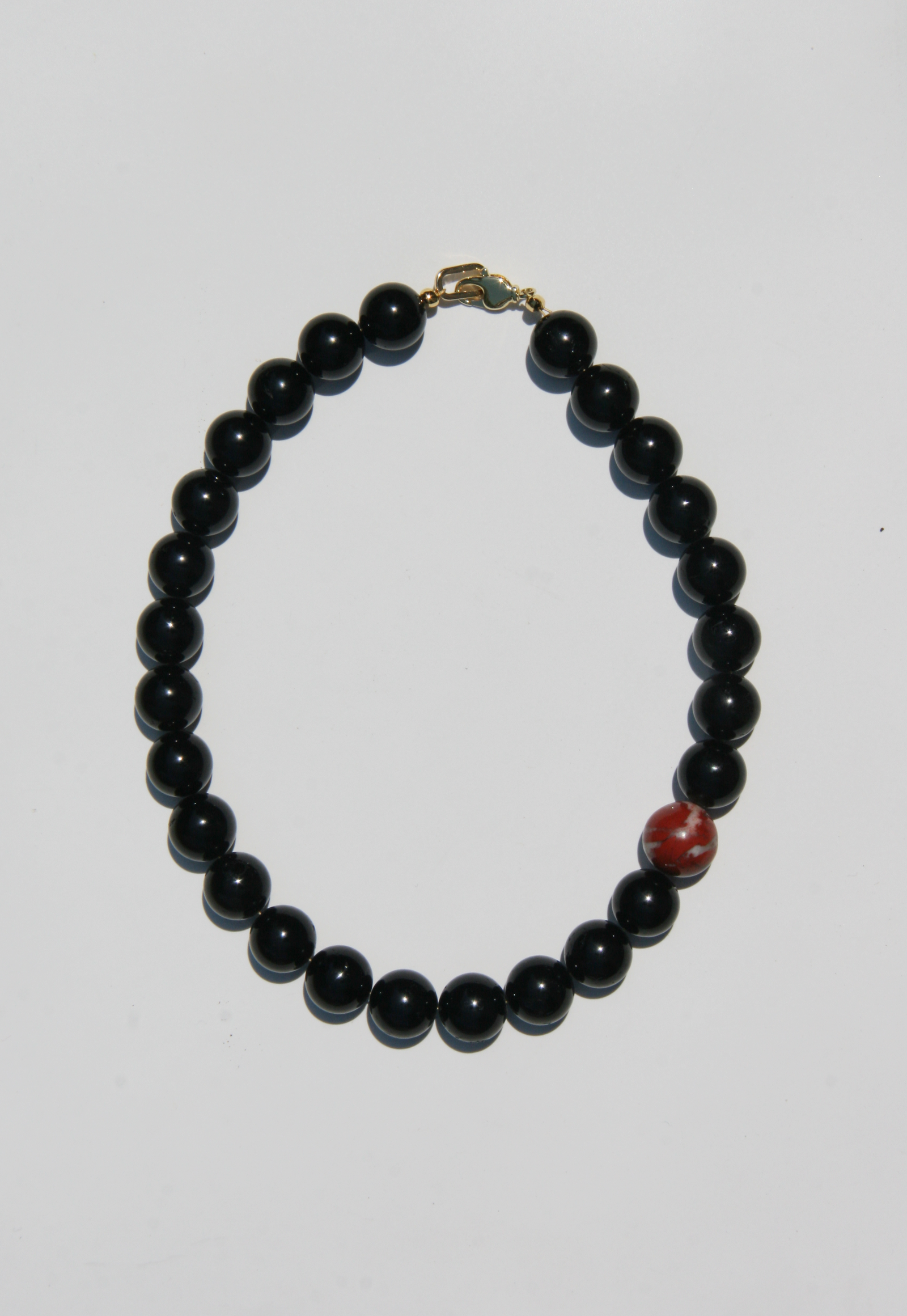 This bold, moody necklace highlights one of our favorite color pairings: rich red and deep black. Featuring polished black tourmaline beads accented with a single red jasper, it strikes the perfect balance of edge and elegance.
