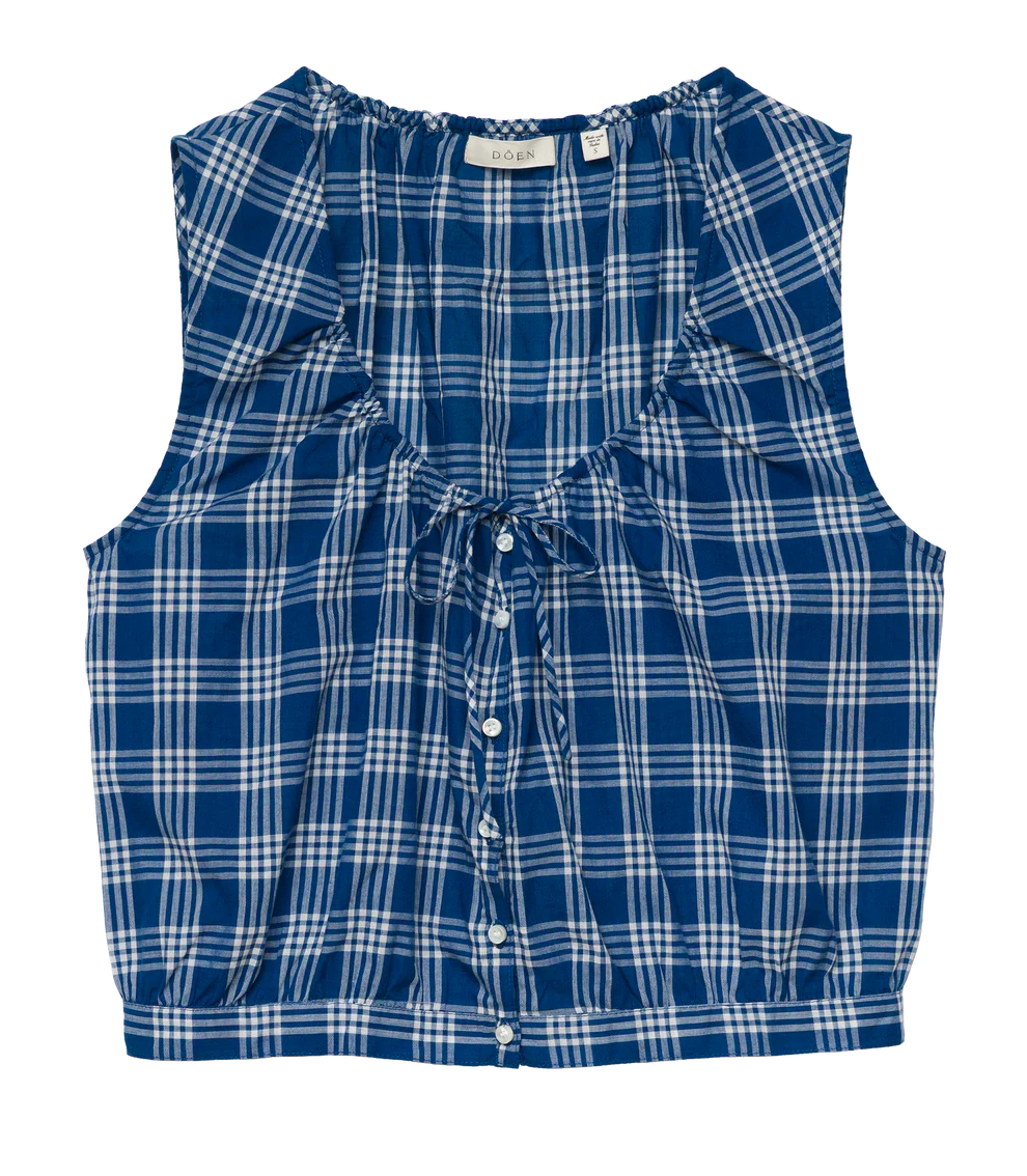 In midweight organic cotton voile rendered in our yarn-dyed Dorset Plaid, the Theo Top has a slightly cropped silhouette and a scoop neckline with a functional tie. A row of mother-of-pearl buttons runs down the center front.