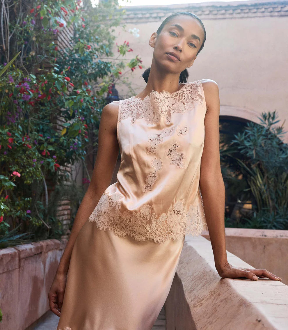 Made from buttery silk satin, the Viviane Top features a relaxed, boxy silhouette adorned with intricate floral lace at the high bateau neckline, bodice, and hem.
