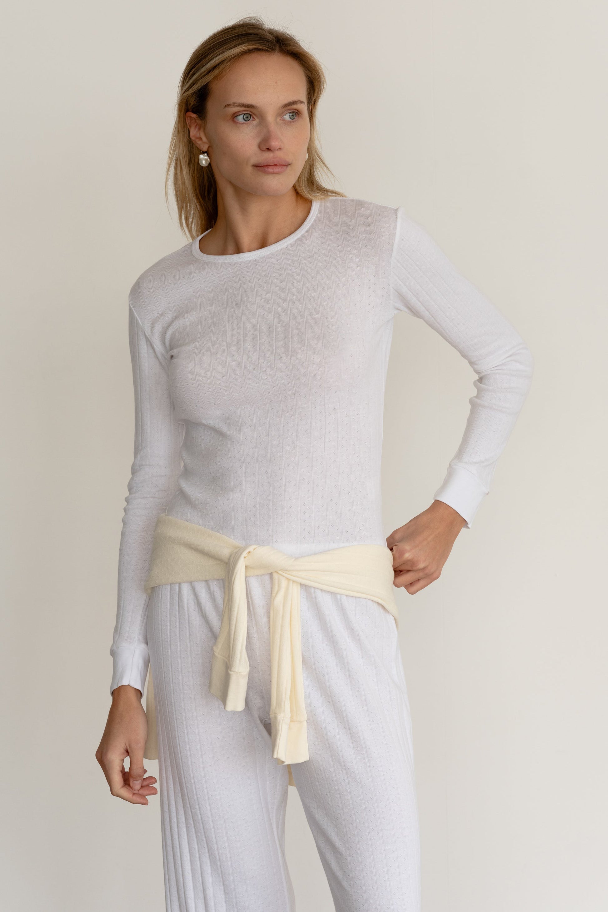 Refined yet effortless, The Pointelle Long Sleeve is crafted from lightweight 100% organic cotton. Featuring a timeless pointelle knit, crew neckline, and baby rib cuffs, it skims the body with a flattering drape—perfect for year-round layering.