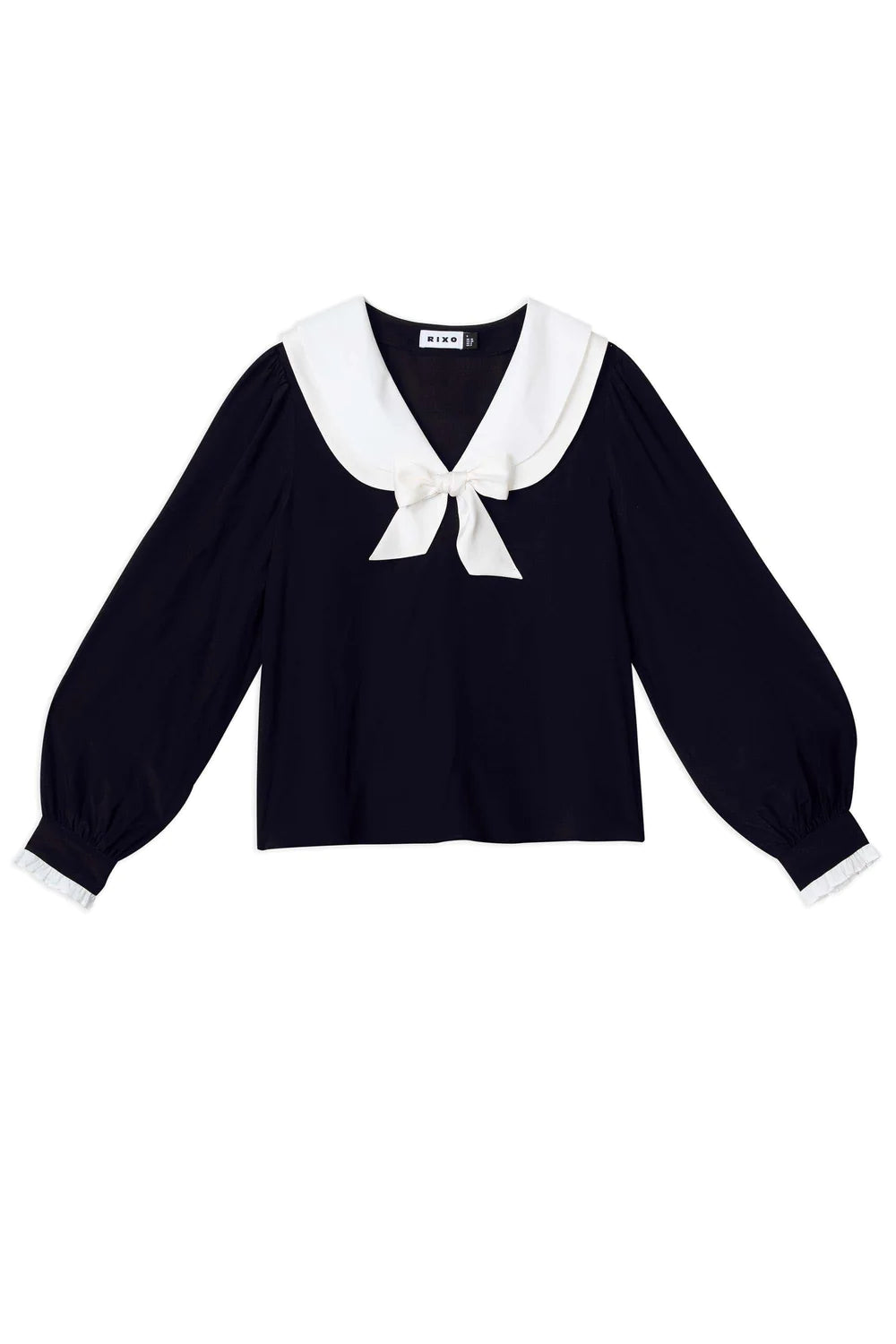 The Eimer silk top is a little nautical inspired, with a layered sailor-style collar and loose navy body. The blouson sleeves are trimmed with ladylike frilled cuffs you don't often see below deck.